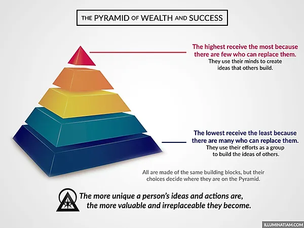 Wealth and success are like streams of water running down a pyramid. The highest receive the most because there are fewer while the lowest receive the least because there are many. Before the water can reach the bottom, first it must run through all the others above it. Though the lowest support the weight of all who are above them, they are numerous and easily replaced — unique individually, but common together. A person climbs higher by becoming less like those below them.